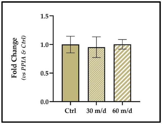 In the ∆∆CT method results, fold changes for each gene were statistically analyzed using the unpaired t-test, without adjustment for multiple comparisons. Where the control was compared with 30 and 60 m/d of ES, a two-way ANOVA was used Tukey’s multiple comparisons test. The metabolic activity assay was also analyzed by a two-way ANOVA.