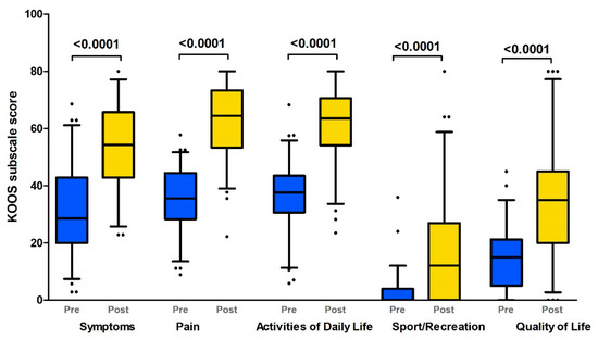 KOOS profiles prior to and 12 months after TKR (Boxplot with 10th–90th percentiles). KOOS subscales: pain; symptoms; activities of daily living; sport and recreation; quality of life (Wilcoxon paired test p-values). Pre: preoperative status; Post: postoperative (1 year after TKR) status.