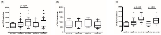 The association of uC2C levels with the radiological severity of kOA in the preoperative period in (A) the whole group, (B) males, and (C) females (boxplot with 10th–90th percentiles, Wilcoxon paired test). KL—grades of radiographic knee osteoarthritis by the Kellgren–Lawrence scoring system; NS—the highest grade of knee OA changes in two knee joint compartments (tibiofemoral and/or patella–femoral joints) by the Nottingham system (NSy).
