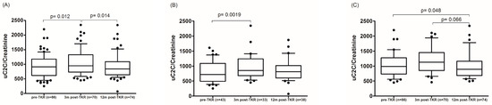 The dynamics of uC2C before and 3 or 12 months after TKR in (A) the whole group, (B) males, and (C) females (boxplot with 10th–90th percentiles, Wilcoxon paired test).