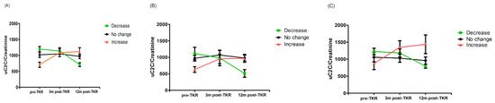 Line plot of uC2C dynamics in (A) the whole group, (B) males, and (C) females, grouped by postoperative uC2C changes (decrease or increase means a > 20% decrease (green) or increase (red) in the 12-month post-TKR uC2C/Crea value compared to the preoperative one; mean and SEM shown).