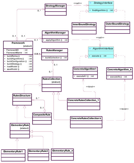The Framework is a concept to which the interoperability concerns are allocated. It delegates the extendible point handling to StrategyManager, AlgorithmManager, and RulesManager components with the extending points: Strategy Interface, Algorithm Interface, and ElementaryRule fabric respectively (see Figure 2).