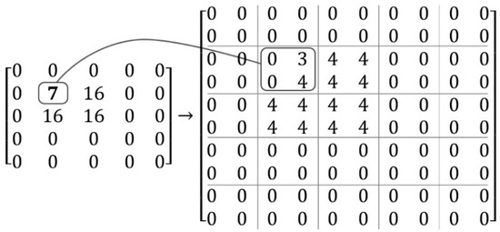 Transformation of the 5 by 5 array into a 10 by 10 array. In this example position of number 7 in the left array dictates the position of a list of numbers [0, 0, 3, 4] in the right array. The position of number 4 is conditioned by the surrounding cells to be next to the highest surrounding cell.