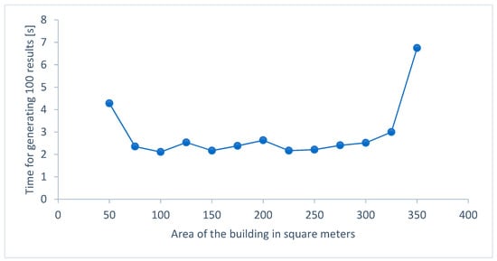 Performance of the method. The graph presents the correlation between the input parameter that represents the area of the building and the average time for generating 100 results. Performance is worse for areas that are lesser than 75 or greater than 325.