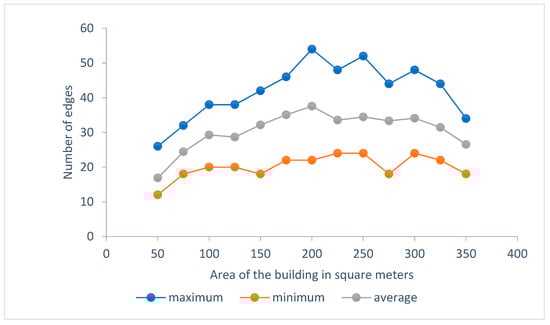Results are measured by the number of edges necessary to draw the border of the building. Borders of the buildings generated by our method show that the number of edges can be a minimum of 12 and a maximum of 54. The distribution of the results is presented in Figure 9. The average values vary corresponding to the input parameter of the building area.