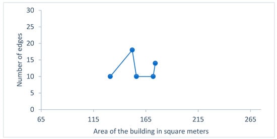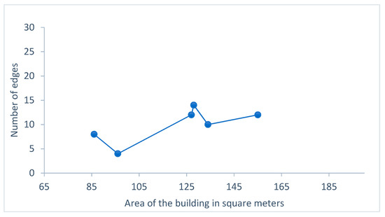 The research of Wu et al. [10,18] can be observed from two aspects. The first aspect is the analysis of the floor plans from traced from the real world [18] where examples are shown in area range of 75 to 125 square meters. The maximum value is 20, and the average is 11.46 edges per building. The second aspect is the analysis of the MIQP-based computer-generated layout [10]. This research presented a similar area range as previously mentioned, but the maximum value of edges is 16, and the average is 7. Results are shown in Figure 12.