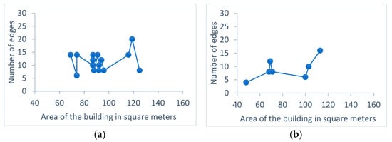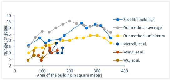 All the results are compared and presented in Figure 14. Differences in the results of different method applications can be observed based on the parameter of the number of edge counts. The overall average of edges per building is 24.73 for selected real buildings, 28.88 for the method described in the paper, and 10.33 for other methods.