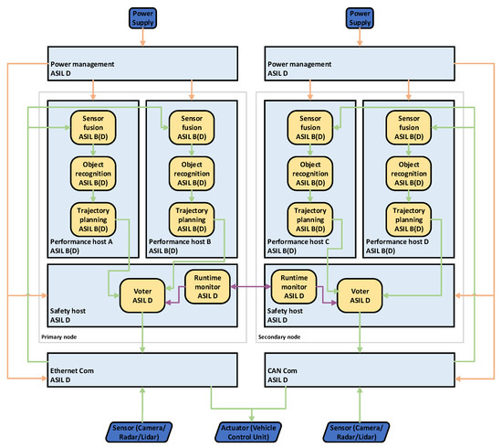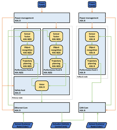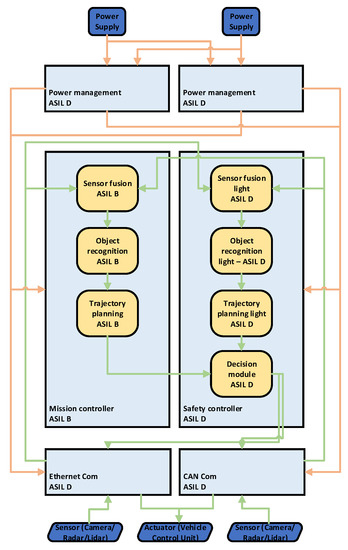 Fail-operational architectures, regardless of the application domain, are very frequently covered in the literature [14,15,16]. Applying those architectures in the automotive domain for enabling autonomous driving functions is not that common. In particular. a classification regarding SAE levels of safety integrity levels is missing most of the time. However, there is still a lot of research published regarding architectures in the automotive domain on the system level, but often purely from the software perspective.