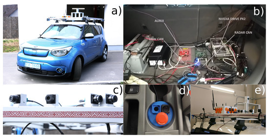 EDI perception system demonstrator. (a) EDI DbW car; (b) high-performance (NVIDIA PX2) and safety (Aurix TC3xx) controllers; (c) SEKONIX SD3323 camera mounting; (d) emergency button for exiting automatic mode; (e) EDI V2X system.