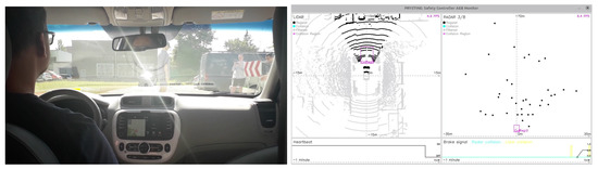 Snapshot of testing use-case with a pedestrian crossing the road without paying attention. Image on the right shows GUI (colours inverted) for the Aurix-based processing of LIDAR and RADAR data, heartbeat monitoring and break actuation.