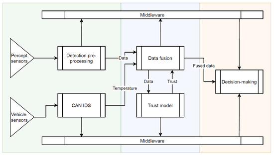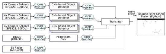 The implementation of the high-performance controller utilizes a combination of system architecture frameworks tailored for deploying software architectures onto embedded Linux-based platforms—COMPAGE (https://gitlab.com/rihards.novickis/compage, access date: 1 October 2021) for component-based software management and ICOM (https://gitlab.com/rihards.novickis/icom, access date: 1 October 2021) for component communication. We have leveraged these frameworks to construct a distributed system with AI-based algorithms capable of identifying faulty sensors by analysing their data, e.g., LIDAR, RADAR, cameras. EDI DbW perception system components and their visualization are described and shown in Figure 8.