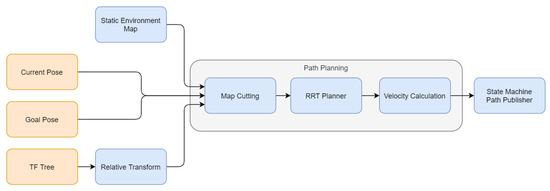 The RRT-based trajectory planner block requires an environment map as well as start and goal positions, based on which path planning is performed. The RRT-based planner calculates a path or generates an error message, which indicates whether a goal state collision exists or if no path is found within the specified time. For the tracking controller, a way-point list with a pose and a set velocity is required. As the RRT-based planner does not provide velocities (see description of Rapidly-exploring random tree on Wikipedia: https://en.wikipedia.org/wiki/Rapidly-exploring_random_tree, access date: 2 June 2021), the path planning module is extended with a block for velocity calculation. The architecture of the path planning pipeline is illustrated in Figure 11.