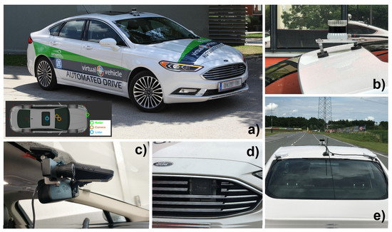 The PVLSA demonstrator vehicle (a) with its perception sensor equipment including LIDAR (b); RGB camera (c); intelligent camera (c), RADAR (d), and dual-antenna GPS with RTK (e).