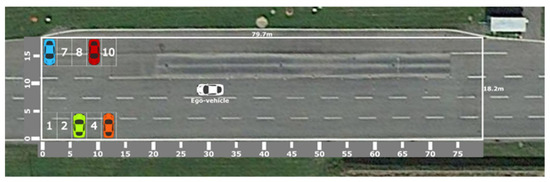 The validation of the RRT-based trajectory planning algorithms for parking was made using a set of scenario-based real-life tests. The test scenario is shown in Figure 14 as a typical parking situation in a static environment setting. The static environment in this context contains 10 parking spots, each one with dimensions m and a distance of 8.2 m across the two rows.