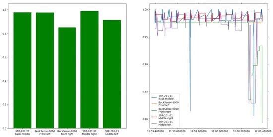 Figure 18 shows a screen capture of the visualisation provided by the trust model. The left half displays a bar chart containing the instantaneous trust in the active sensors. The right-hand graph displays a history of the most recent trust evaluations over the past second (note the vertical scale). Additionally, Table 3 contains the results of the implementation’s benchmark test. The average runtime column shows the runtime of the major methods used during the trust model’s operation. The evaluate method is the one responsible for trust evaluation and is called from handle_phase1 if the received data are suitable for evaluation, i.e., are not vehicle CAN data containing environmental information. The frequency column corresponds to the respective frequencies, rounded down to the nearest hundred Hertz, representing the maximum evaluation rate.