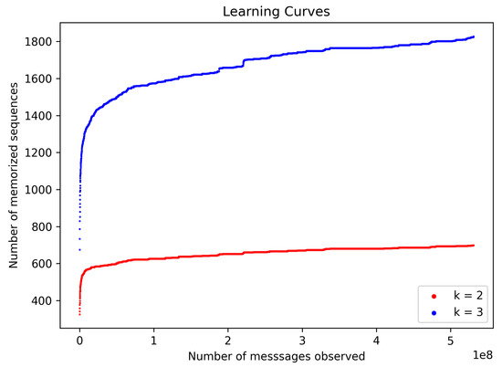 The developed CAN bus IDS operates by detecting anomalies in k-sequences. We define the term k-sequence as a length k sequence of CAN bus identifiers, and it is treated as a hyperparameter. The IDS can be described in two operational phases: training and testing phases. In both phases, IDS takes in a k-sequence as input and processes CAN bus messages one at a time. Every k-sequence encountered during the training phase is memorised and stored in an internal data structure, which serves as a whitelist. Contents of the whitelist, at the end of the training phase, correspond to the learned model. In the testing phase, each received CAN frame appears in a number of k-sequences, each of which is looked for within the trained model, and an alert is raised if not found. Behaviour in the testing phase also describes a normal mode of operation of the IDS. Figure 19 below depicts the model as it matures with the reception of additional CAN messages during the training phase.