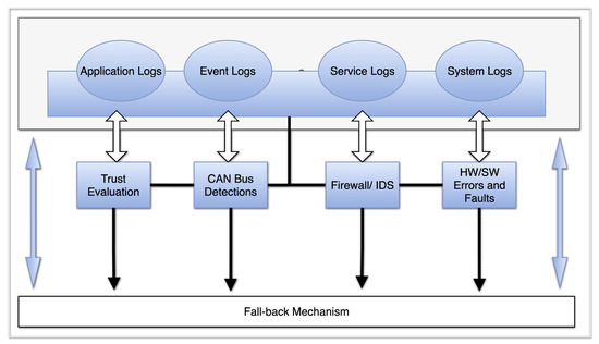 The developed CAN bus IDS is integrated into the overall system as shown in Figure 16, and its outputs are to be used in the middleware for the system-health check, which will then be displayed to the driver. In the future, the possibility for more effective actions could be investigated, such as a safe-stop (during an ongoing cyber-attack). The practical value of a vehicular CAN bus IDS can be judged by its specificity, sensitivity, hardware requirements, and latency. There are several different approaches to building a CAN bus IDS. It is a real challenge to come up with a single approach that has all the desired properties, as different approaches have different strengths. Combining several complementing approaches is one way to obtain a more complete solution, but of course, hardware requirements and latencies add up. With this understanding, we focused our efforts on a partial solution that is suitable for combining with other solutions due to its lightweight nature.