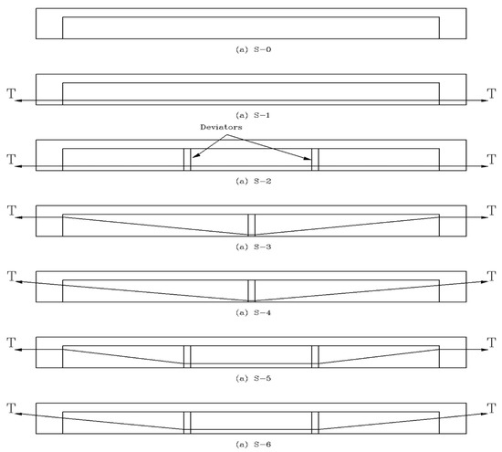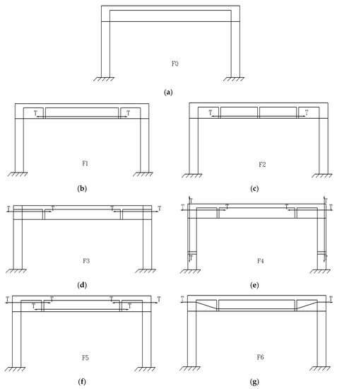 Deviators were used to change the profile of the external tendons and the technique of external pre-stressing strengthening. According to the number of deviators parameter, there were two types of tendon profile, namely, straight line along the beam of the frame, and U-shaped line with two inflection points (a fifth of the beam span).With respect to the tendon profile parameter, there were six frames, including: two frames with tendons in the positive bending zone of the beam (F1, F2), a frame with tendons in the negative bending zone of the beam (F3), a frame with tendons in the negative bending zone of the beam and the column of the frame (F4), a frame with straight-line tendons along the beam span in both the positive and the negative bending zones (F5),and a frame with U-shaped line tendons along the beam span (F6). The original sample (F0) and the six strengthened samples are presented in Figure 1.