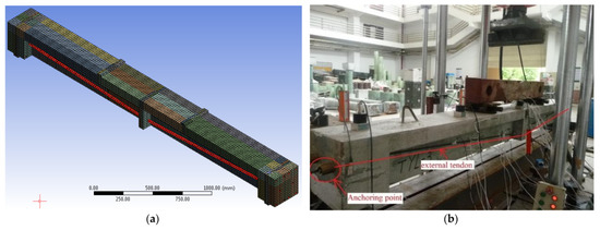 Profile of the external tendon and loading: (a) finite element; (b) laboratory.
