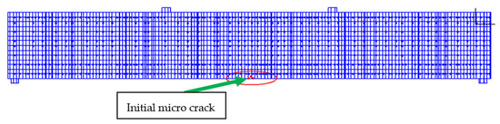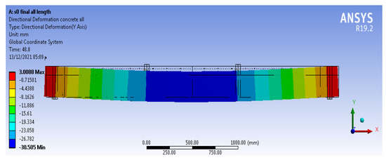 The comparisons between the analytical predictions and the experimental results of the entire load-midspan deflection response of the beam specimens are presented in Figure 12. It can be seen from Figure 12 that the FE model reproduced the experimental load–deflection response from zero loads up to ultimate with considerable agreement. It can also be seen that the curves exhibit approximately three different stages during the loading process. The transition from the first stage to the second stage was the result of the cracking of the concrete, while the transition from the second stage to the third stage was the result of the yielding of ordinary reinforcing steel. The third stage was the failure stage, with maximum mid-span deflection, as shown in Figure 13. These stages of loading and failure were presented in the previous validation.