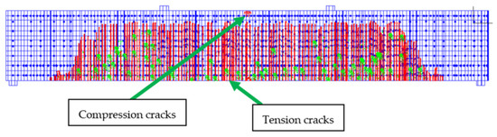 For the sample S0 (control beam), the first micro-crack was recorded at the bottom of the beam in the middle-third part when the load reached 8 kN and the maximum deflection was less than 1 mm. At this point, the load was listed as a cracking load, as shown in Figure 7. While the loading continued to increase, the deflection and the concrete strain of the sample increased simultaneously; the number and the size of the cracks in the middle third part also increased. In addition, the cracking part moved from the pure bending region (middle third) to the bending shear region (two edge thirds). The stress of the tensile steel reinforcement of the sample S0 reached its yield strength when the loading value and the maximum deflection of the sample recorded 11.5 kN and 3.42 mm, respectively. At this point, the load was listed as the yield load. After this point (the yield point), the steel reinforcement could no longer carry the load and the strain of the sample increased rapidly, leading to an increase in the width and length of the cracks over a short time. Finally, when the load value and the maximum deflection of the sample recorded 69.63 kN and 30.41 mm, respectively, the cracks expanded through the section’s tensile region to the compressive region and the sample failed in a typical flexural failure with a large deflection, as shown in Figure 8 and Figure 9. At this point, the load was listed as the ultimate load (load-carrying capacity). The FE’s process of failure was similar to the experimental test process.
