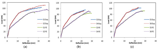 Load–deflection curves of experimental tests [1] and FE models: (a) sample S1, S2; (b) sample S3, S4; (c) sample S5, S6.