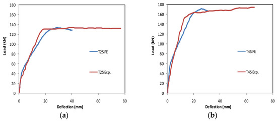 Load–deflection curves of experimental tests [19] and FE models: (a) specimen T2S; (b) specimen T4S.