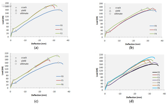 Load–deflection curves for F0, F1, F2, F3, F4, F5 and F6: (a) straight–line tendons at the positive bending zones of the frame–beam (F0 with F1, F2); (b) straight–line tendons at the negative bending zones of the frame (F0 with F3, F4); (c) straight–line and U–shape line tendons along the frame–beam (F0 with F5, F6); (d) all tendon techniques versus the original frame (F0 with F1, F2, F3, F4, F5, F6).
