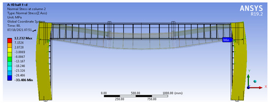During the loading test of the frame, the normal stresses of the columns were recorded, especially in the top points of the columns, where the maximum negative bending moment was expected, as shown in Figure 18. Table 2 presents the values of the column’s normal compression stresses for all the samples during the test stages. From the table data, it can be observed that the sample with vertical tendons (F4) caused the highest stress in the columns during all the loading stages compared with all the samples because the pre-stressing of the tendons was parallel to the columns, resulting in additional compression in the columns. Furthermore, the samples in which the tendons were placed in the zone of the lower beam (sample F1, F2, and F5) decreased the value of the column stresses compared to other samples. Therefore, it is recommended to place a tendon in the positive bending zone of the frame parallel to its beam.
