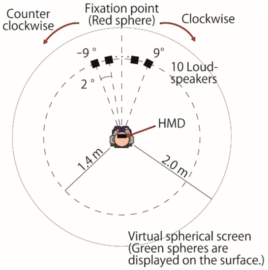 In the control condition, the green spheres did not move. The participants were instructed to press the switch button if they perceived the spheres. Immediately after the participants pressed the button, the acoustic stimulus was deployed from one loudspeaker located within ±9.0° of the participants’ subjective midline orientation. The participants were asked to identify the direction of the sound image. Two sessions were conducted for each participant, resulting in 100 trials.