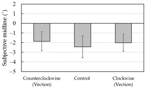Figure 2 shows the average of the subjective midline and standard errors. One-way repeated-measure analysis of variance (ANOVA) was performed on the subjective midline with the experimental condition as a factor; three experimental conditions were considered—counterclockwise, control, and clockwise. The main effect of the experimental condition (counterclockwise, M = −1.86; control, M = −2.44; clockwise, M = −2.03) was not significant (F (2, 18) = 0.51, n.s., η2 = 0.05).