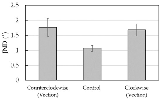 Figure 3 shows the average number of JNDs and standard errors. A one-way repeated-measures ANOVA was performed on the JNDs with the experimental condition as a factor. As in the case of the subjective midline, three experimental conditions were considered. The results showed that the main effect of the experimental condition was significant (F (2, 18) = 5.50, p < 0.05, η2 = 0.38), and multiple comparison analysis (Bonferroni’s method, p < 0.05) [28] revealed that JND was smaller for the control condition (M = 1.06) than for the vection condition (counterclockwise, M = 1.77; clockwise, M = 1.68). No significant difference was noted between the counterclockwise and clockwise conditions.
