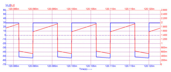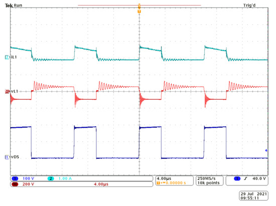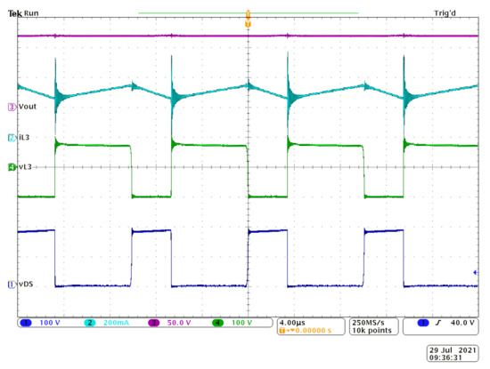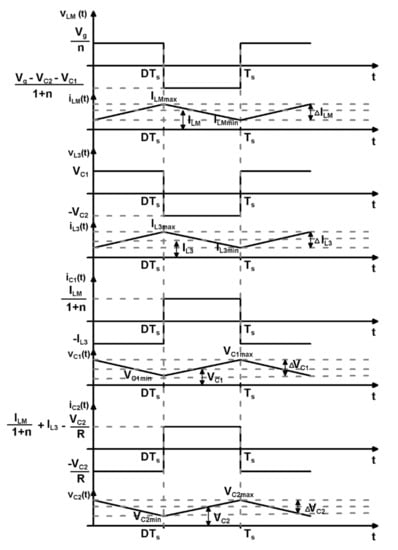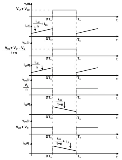 The magnetizing inductor voltage vLM is piecewise constant, exhibiting a rectangular shape, while the magnetizing inductor current iLM is piecewise linear, increasing until D∙Ts, because vLM is positive in the first topological state and decreasing in the second topological state, when the voltage is negative. Similarly, the same theoretical waveforms are associated for inductor voltage vL3 and inductor current iL3. Internal capacitor current iC1 and output capacitor current iC2 are piecewise constant, resulting in a piecewise linear internal capacitor voltage, vC1, and output capacitor voltage, vC2. The semiconductor waveforms, depicted in Figure 6, result from taking into account that, when “ON”, the semiconductor currents are linear combinations of inductor currents and the same is true for semiconductor voltages. These linear combinations values are also specified in Figure 6.