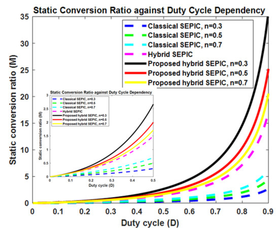 The dependency of the static conversion ratio against the duty cycle for the classical isolated SEPIC [61], the hybrid SEPIC from [24] and the proposed hybrid SEPIC-based converter is presented in Figure 7. For a better representation, a detail for a duty cycle between [0–0.5] is provided.