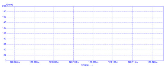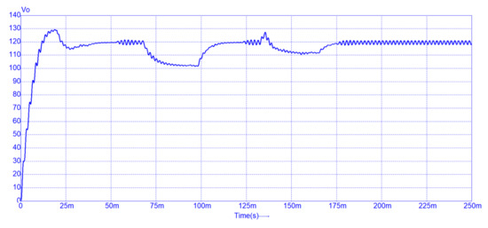 Figure 28 presents how the output voltage modifies along the proposed scenario. It is confirmed that the desired dc output voltage value of 120 V can be achieved if the irradiance and the load are high enough and they do not modify.