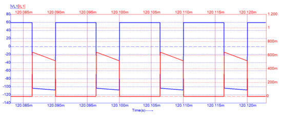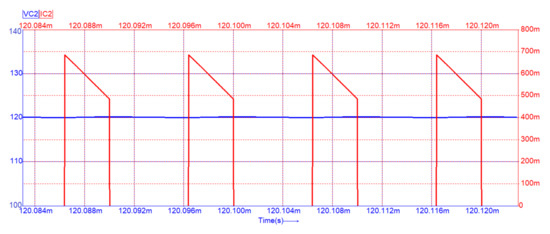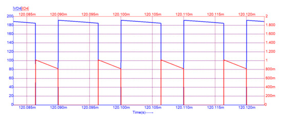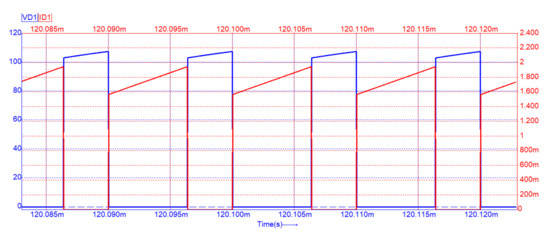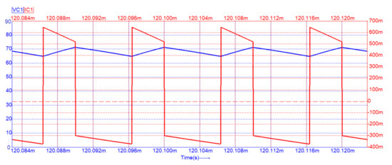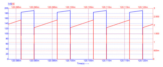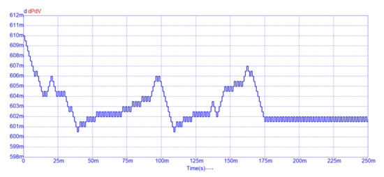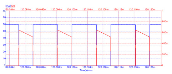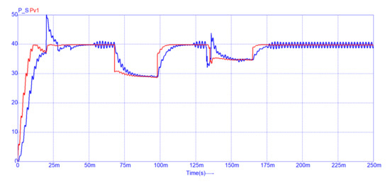 The simulation time was 250 ms. The simulation step chosen was 20 ns, and the results were displayed each one hundred simulation steps. In Figure 25, the input (red) and the output (blue) power against time are represented. With these characteristics, the changings according to the scenario can be easily identified, and it can be remarked that the MPPT control regulates the absorbed power from the panel. The regulated power value is about 40 W at an irradiance equal to 1000 W/m2, 30 W at 800 W/m2 and around 35 W at a solar irradiance of 900 W/m2.