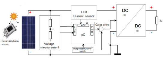 In this section, the novel proposed converter supplied by two PV panels connected in series and having P&O as a MPPT method is presented. For solar irradiance and PV temperature measurement, a pyranometer [70] was used. The pyranometer produces a voltage (VGPV) proportional to the incident solar irradiance. For the PV temperature measurement (TPV), the other pyranometer voltage (VTPV) is measured and the temperature can be found according to the formula [70]: