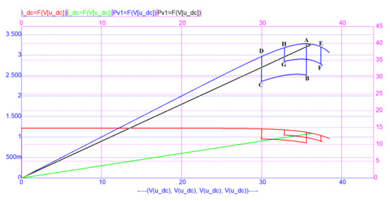 The current-voltage and power-voltage characteristics of the PV module can be seen in Figure 26. During the simulation, the instantaneous position of the operating point (OP) on the current-voltage (I-V) characteristic is shown with the green arrow, while the black arrow points to the instantaneous position of the operating point on the power-voltage (P-V) characteristic. The system is able to reach the MPP, even if the OP is located before or after the MPP. The MPP can be found at the point marked on the graph with “A”. Because the load was initially set to R = 450 Ω, the characteristics passed through the MPP, and overpassed point “E”. Changing the value of the load to R = 325 Ω determined the return to point “A”, but overpassed point “A” to the left. Adjusting the resistor to R = 350 Ω caused the return to point “A” but slightly exceeded to the right, with small oscillations around point “A”. When T4 = 37 ms, the output resistance was changed to R = 360 Ω, which determined the return to and placement in point “A,” corresponding to the MPP. A step transition in solar irradiance from G1 = 1000 W/m2 to G2 = 800 W/m2 produced a displacement from points “A” to “B” and an evolution on the PV characteristic related to point “C”. A step increase in the irradiance to 1000 W/m2 produced a jump of the characteristics from “C” to “D” and a progression of the PV characteristic that ended with the value of the solar irradiance corresponding to point “A”. Changing the value of the load to R = 460 Ω determined the exceedance of point “A” to the right. Because at T8 = 135 ms, the irradiance was set from G3 = 1000 W/m2 to G4 = 900 W/m2, again a jump took place from point “E” to point “F” and a search of the MPP on the characteristic corresponding to 900 W/m2. When the load was changed back to R = 360 Ω, it determined a return to the left of the characteristics, finally reaching the point “G”. The last modification of the solar irradiance, back to G5 = 1000 W/m2 produced a jump from “G” to “H” and a displacement on the solar irradiance characteristic to the point “A”. At the end, small oscillations around point “A” could be observed due to the P&O MPP algorithm.