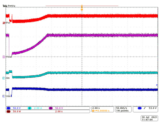 Figure 29. Oscilloscope waveforms at start-up for: input voltage “Vin” (dark-blue), input current “Iin” (cyan), output voltage “Vout” (purple), and input power “Pin” (red), in down to up order.