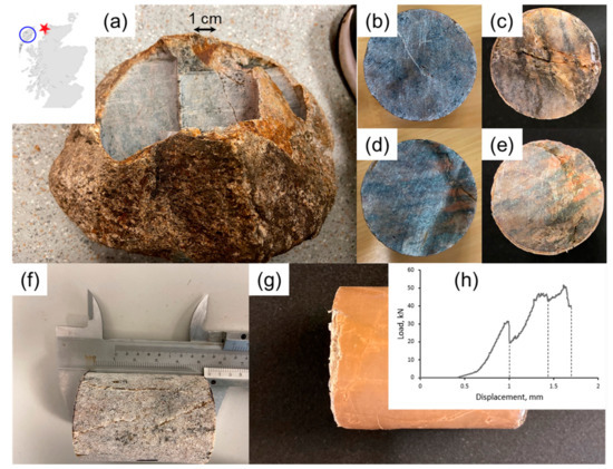 Rock sample used in this study was cut from the weathered outcrop boulder (a) collected from the Clashnessie area denoted by the red star on the inset map (refer to the geological map of the area, S1, in the supplementary material); the core sample was naturally fractured as demonstrated by the top (b), bottom (d) and side (f) views; the sample was loaded along the longitudinal axis resulting in at least one fracture that extended from the top face (c) to the bottom one (e); to preserve its cylindrical shape during uniaxial loading, the sample was wrapped in duct tape (g) and experienced fracturing that corresponded to bulk displacements of 1 mm, 1.4 mm and 1.7 mm, as demonstrated by the load [kN] vs. displacement [mm] graph (h).