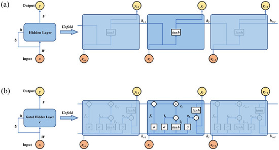 The forerunner of LSTM neural network is Recurrent Neural Network (RNN) [91], which is the evolution of Multi-Layer Perception and is capable of processing sequential data due to its short-term memory ability. The memory ability is realized by the so-called hidden state h which is transmitted from the former hidden layer cell to the next which is the major improvement to Feedforward Neural Network [92]. A traditional RNN structure whose hidden layer is unfolded into a full network is shown in Figure 1a, and the formulas correspondingly are shown as follows: