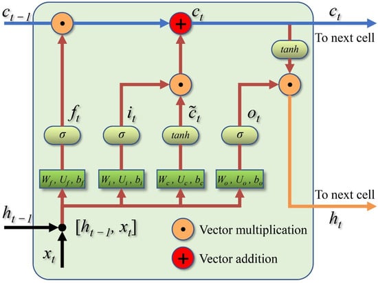 Compared with RNN, LSTM neural network [82,83], as shown in Figure 2, introduces a new internal state , which deliveries information linearly to the next hidden layer cell and outputs information nonlinearly to the hidden layer’s external state (which is analogous with the hidden state in RNN). and are expressed as follows: