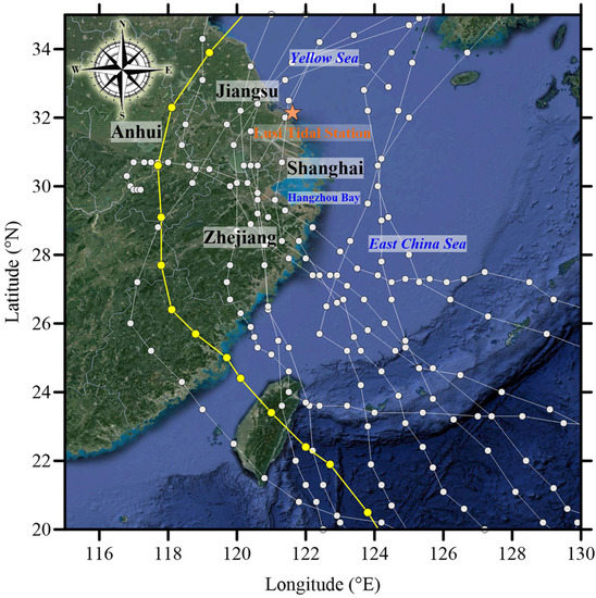 The East China Sea with the tracks of 12 typhoons from 1986 to 2016. The yellow line represents the track of Typhoon No. 1410 in 2014 and the white lines represent the tracks of the rest 11 typhoons. The time interval between contiguous dots is 6 hours.