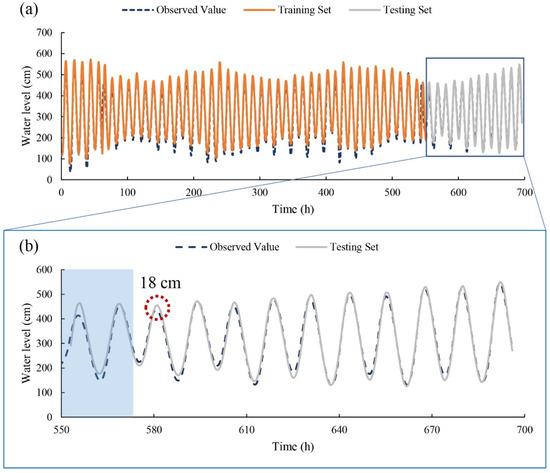Figure 4 shows the model results of the LSTM model with 1 h prediction time and its ACC value of training set is above 0.95 to guarantee the model precision. The testing set is calculated for prediction of the water level using the hyperparameters derived by training the LSTM model based on the training set. In Figure 4b, the light blue area represents a cold start period of 24 h for testing set calculation and it is not considered into analysis. In terms of the model evaluation for testing set, the values of MAE, RMSE, and ACC are 13.40, 16.28, and 0.95 respectively, as shown in Table 2. The testing set agrees well with the observed water levels. Since the peak value of water level is the most concern during the time series, the differences of each peak value are calculated and the maximum difference is 18 cm circled by the red dash line in Figure 4b. In general, the 1 h prediction ability of the LSTM model performs quite well.