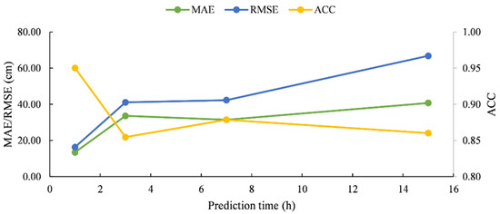 Figure 6 shows the MAE, RMSE, and ACC values of testing set for the LSTM model with 1 h, 3 h, 7 h, and 15 h prediction times. Difference has a consistent augment trend for the maximum difference between the modelled and observed values, i.e., the MAE value increases sharply from 1 h prediction time to 3 h prediction time by 150%, which is followed by a slightly decrease from 3 h prediction time to 7 h prediction time by 6% and a moderately increase from 7 h prediction time to 15 h prediction time by 29%. It might be due to the nature of MAE which is the average of the absolute difference value between the modelled and observed values. The variation of RMSE with the prediction time displays a similar form to MAE while ACC shows an inverse pattern. For simplicity, it is feasible to select one of these three methods to evaluate the model. For example, when MAE is taken as the criterion, its value for 1 h and 15 h prediction times is 13.4 cm and 40.7 cm respectively. Based on the 20-year return period storm surge value of 186.5 cm [97], the percentage error of 1 h and 15 h prediction times are 7% and 22% respectively. Finally, it can be concluded that the LSTM model performs precisely for 1 h prediction of water level during the storm surge period and it can also provide a 15 h prediction of water level within a limited error.