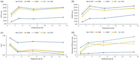 Figure 8 shows the model evaluation of testing set for MAE, RMSE, ACC, and Maximum Difference with 1 h, 3 h, 7 h, and 15 h prediction times. In Figure 8a–c, the variation patterns of MAE, RMSE, and Maximum Difference are consistent for all the five models, i.e., their values increase sharply from 1 h to 3 h prediction time and then increase or decrease slightly from 3 h to 15 h prediction time. In Figure 8c, variation trend of ACC is on the contrary to the other evaluation metrics. In the four subplots of Figure 8, the evaluation values of LSTM (dark blue line) are separated from the other four models, which indicates that its prediction performance is visibly superior to the four traditional ML models. Taking ACC as the evaluation metric, the average ACC values of LSTM and the traditional ML methods for the four prediction times are 0.89 and 0.7, and therefore LSTM has a superior prediction ability by 27%.