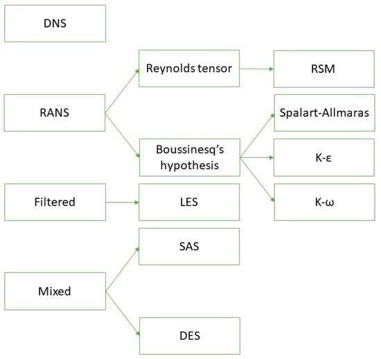 Classification according to the CFD methods calculation. DNS: direct numeric simulation; RANS: Reynolds average Navier–Stokes; RSM: Reynolds stress model; LES: large eddy simulation; SAS: scale adaptive simulation; DES: detached eddy simulation.