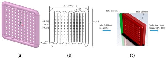 The 3D scaffold, including an (a) isometric view and (b) basic dimensions. (c) Two domains: the enclosure domain and model domain.