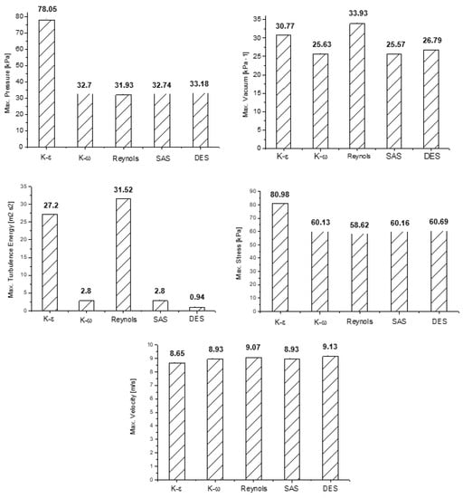 Using these results, it was possible to choose the best FSI method that led to the continuation of the study. The K-ε model was rejected, as its outputs showed noticeable discrepancies compared with those obtained with the rest of the models. Similarly, the Reynolds model was discarded based on the outputs observed in the turbulence graphic. Despite the fact that the remaining three models showed minor differences, the DES model was finally selected, as the other two models (K-ω and SAS) provided similar turbulence results. The DES model reached a better performance by considering smaller or lower energy eddies.