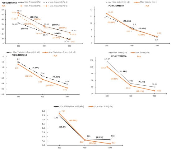 For each of the materials used in the comparison, the parallel between the DES calculation in the scaffolds containing different pore sizes (300, 400 and 500 µm) is shown in Figure 4. Despite a higher speed value than reported in previous studies, the used material supported the blood-induced viscous stress in the three configurations of the pores. As the size of the pore increased, the decreasing tendencies in all the physical properties showed significant improvements, resulting in permeability enhancement [17,18,19]. It is interesting to observe that the pressure drops as low as 300 µm for PLA, while PEI turns out to be the highest of all. In all the physical properties studied, PLA shows similar results to PEI, highlighting an improvement in pore size of 400 µm in viscous tension. This reveals that this pore size could be very suitable for this material. PLA shows improvement ratios between pore sizes in all the properties studied.